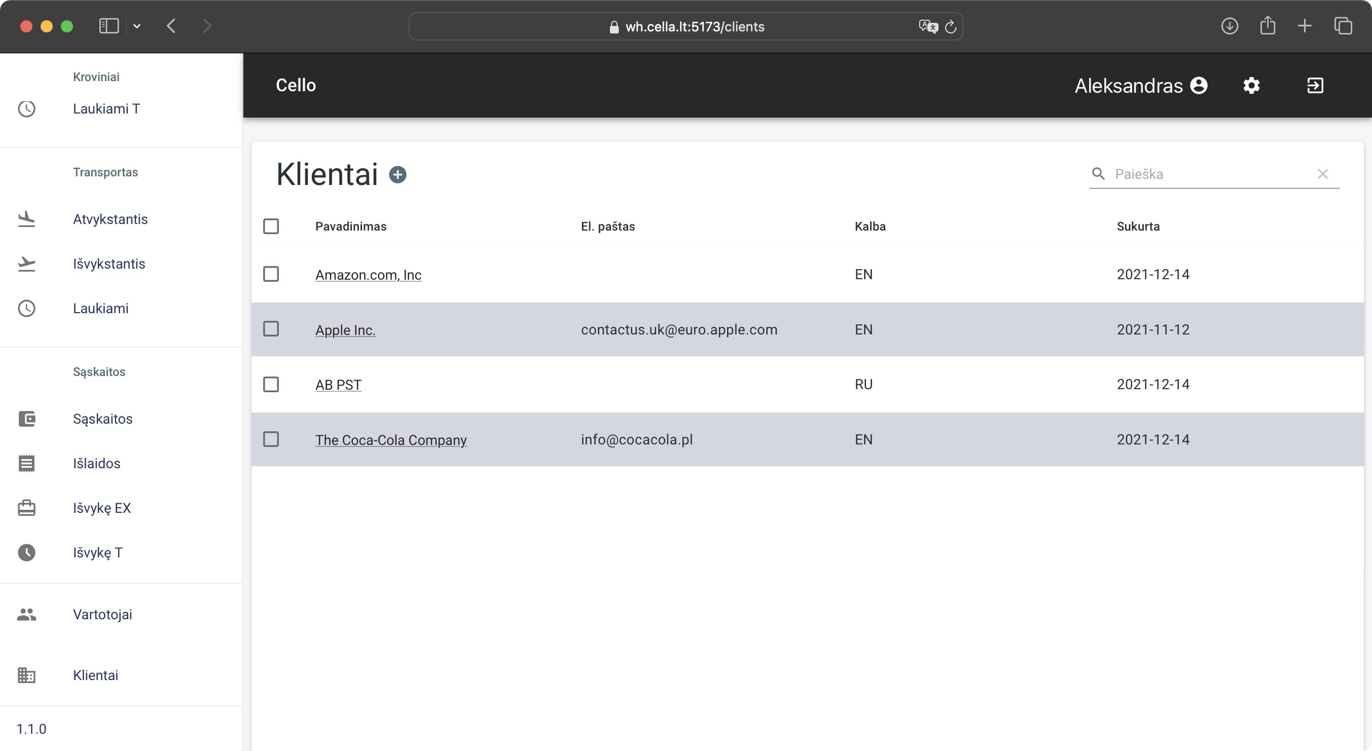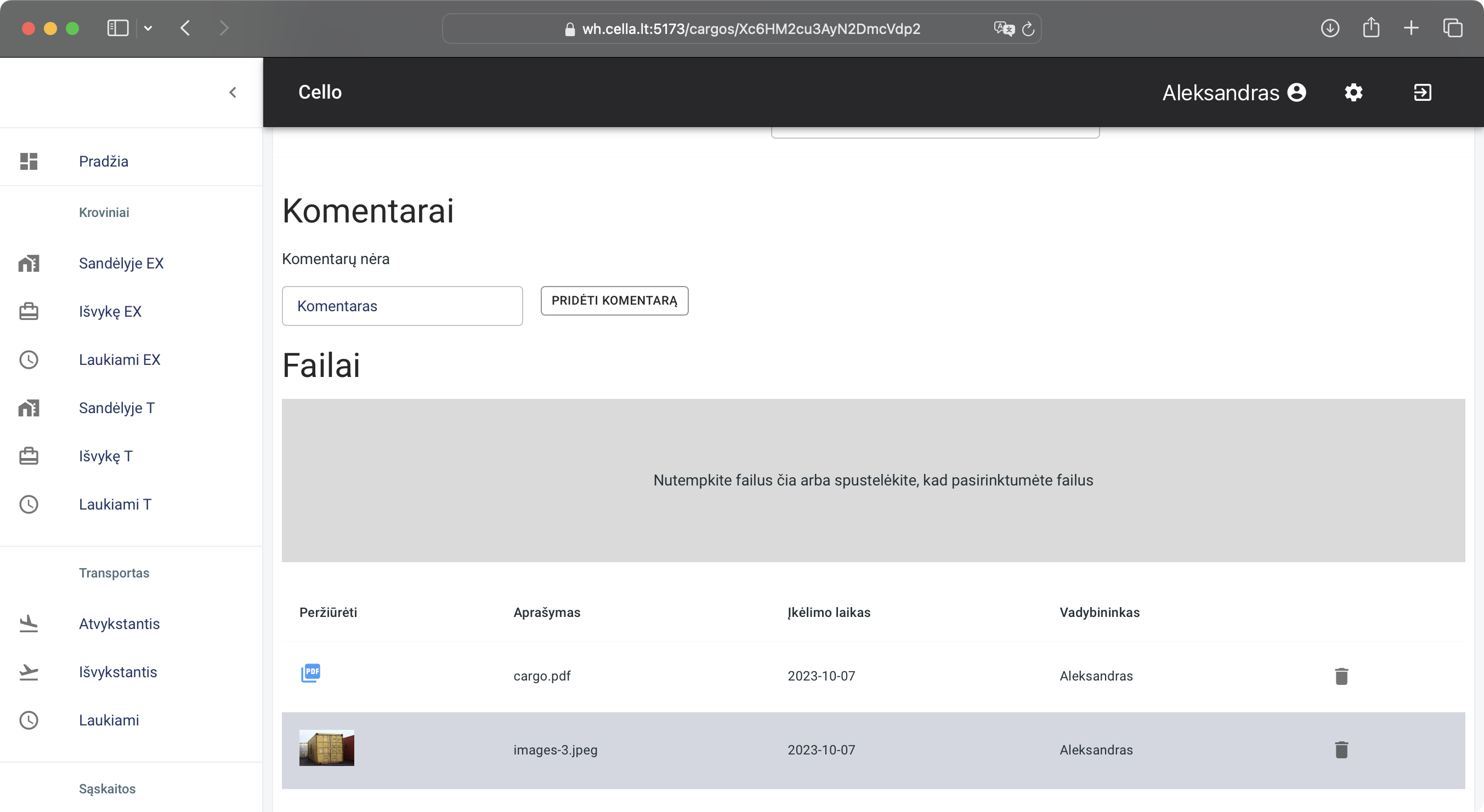 Klientas turi savo prisijungimą prie sistemos ir gali matyti visus savo krovinius ir savo sąskaitas bei tenkančias išlaidas.