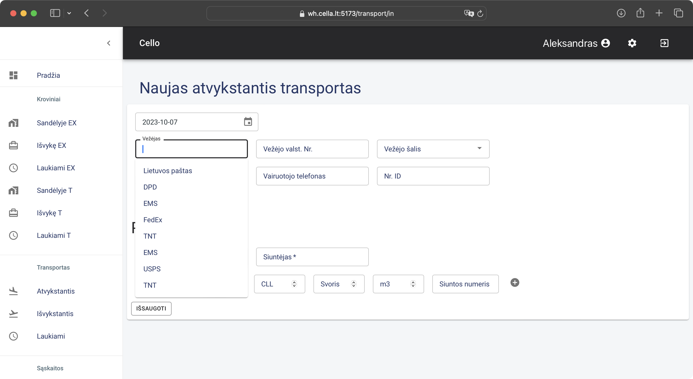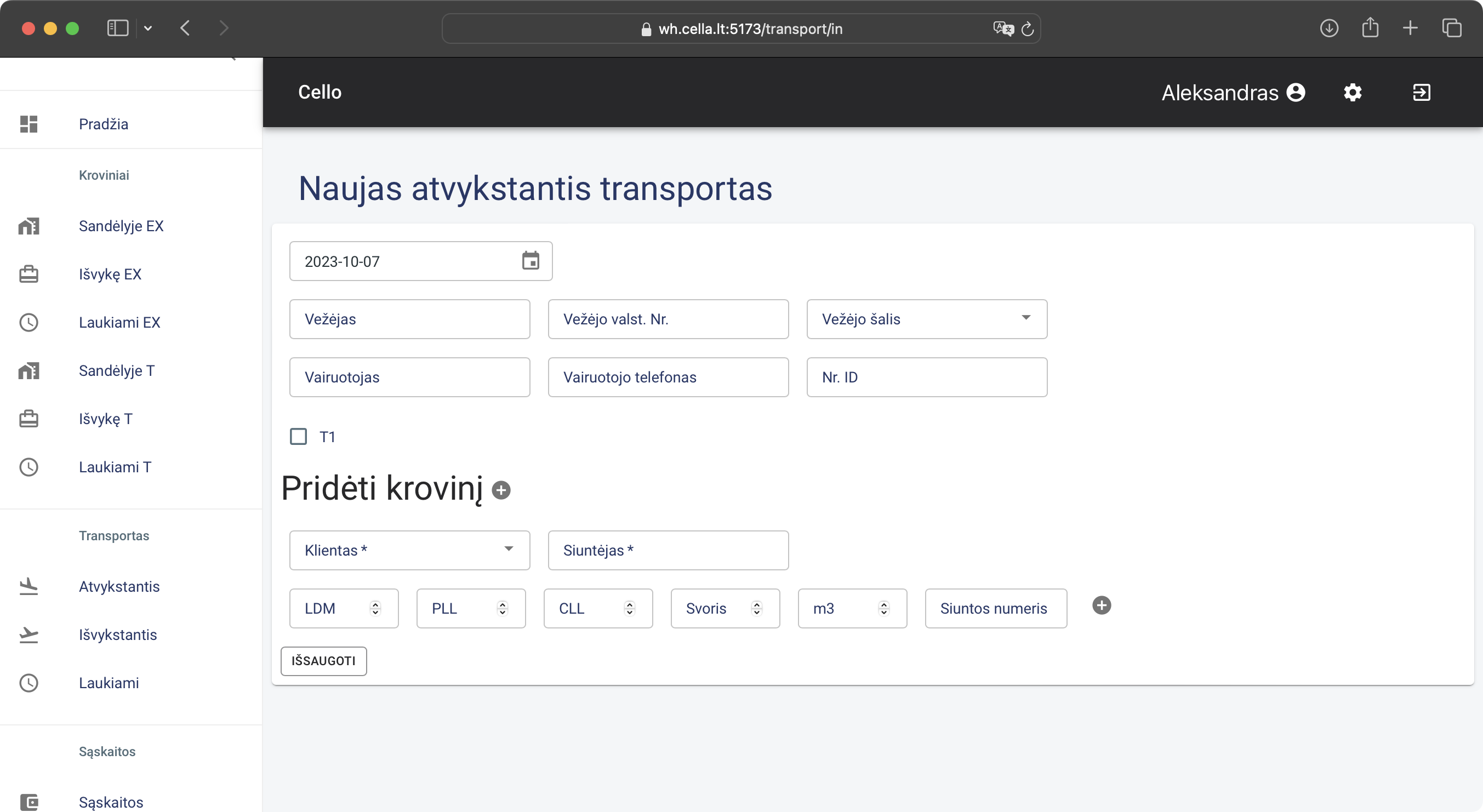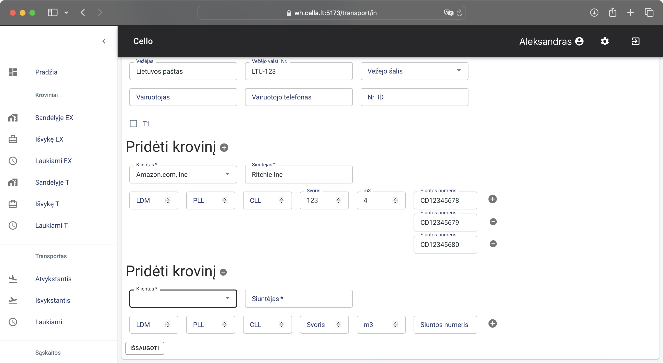 Galimybė įvesti transporto duomenis ir pridėti krovinių sąrašą.